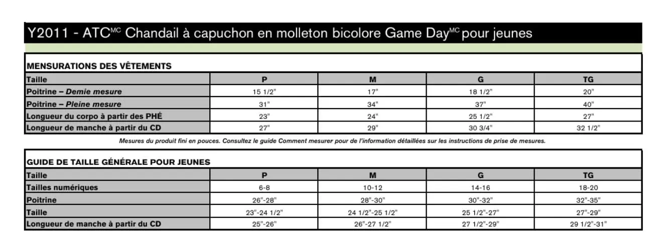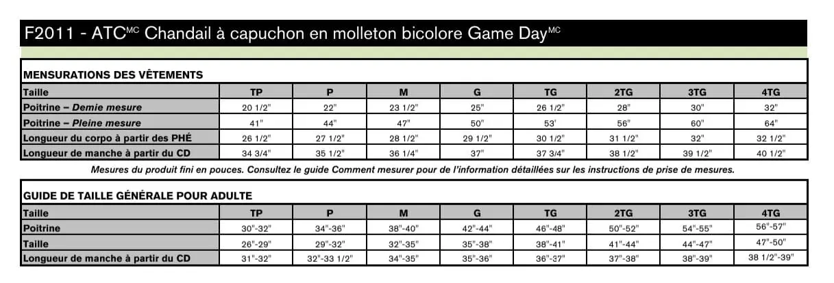 | GRANDEURS | Small Enfant, Medium Enfant, Large Enfant, X-Large Enfant, Adulte (X-Small), Adulte (Small), Adulte (Medium), Adulte (Large), Adulte (X-Large), Adulte (2X-Large), Adulte (3X-Large), Adulte (4X-Large) |