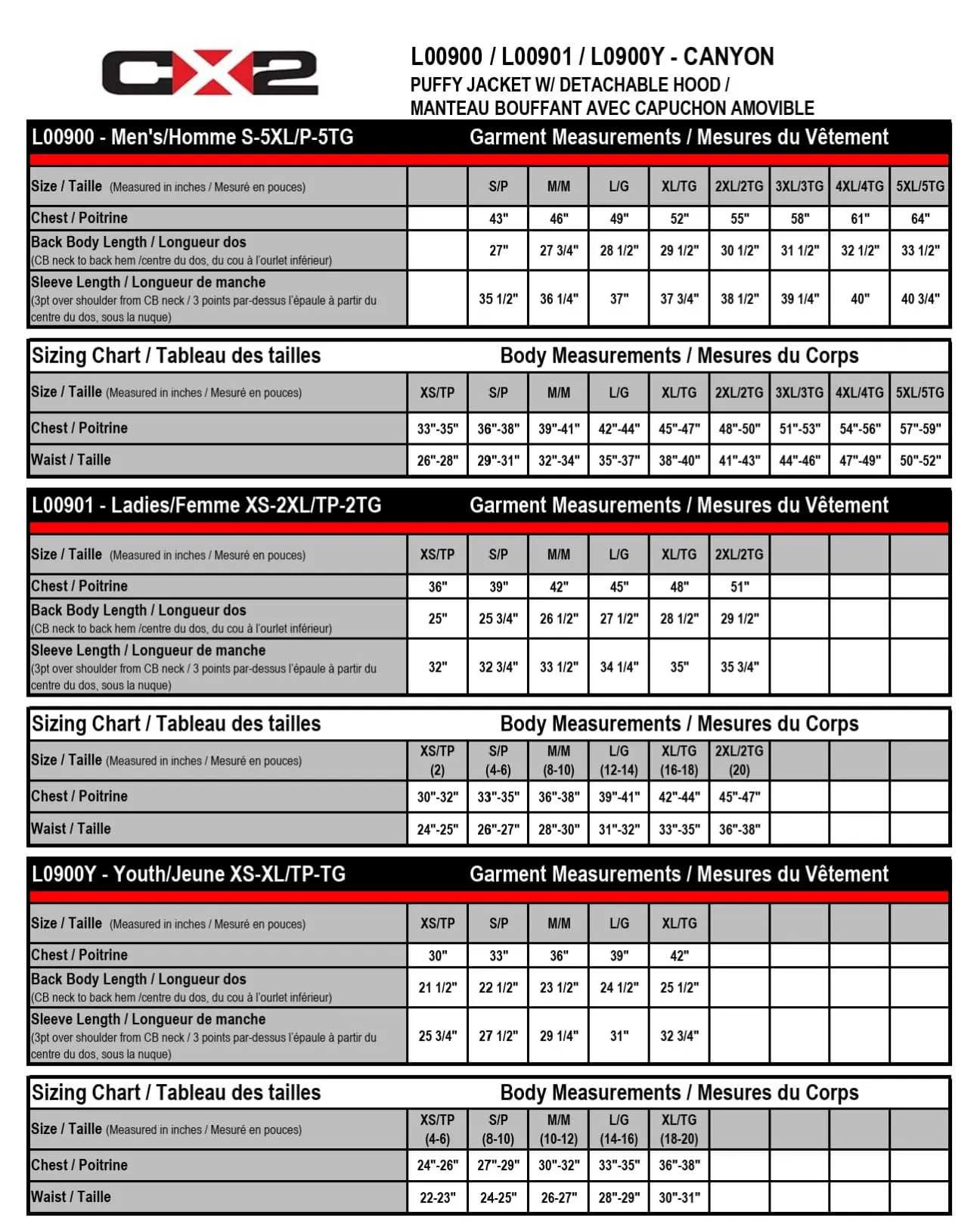 X-Small Enfant, Small Enfant, Medium Enfant, Large Enfant, X-Large Enfant, Femme (X-Small), Femme (Small), Femme (Medium), Femme (Large), Femme (X-Large), Femme (2X-Large), Homme (Small), Homme (Medium), Homme (Large), Homme (X-Large), Homme (2X-Large), Homme (3X-Large), Homme (4X-Large)