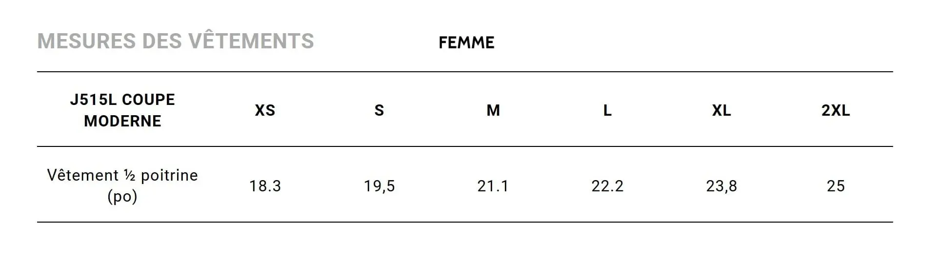 | GRANDEURS | Femme (X-Small), Femme (Small), Femme (Medium), Femme (Large), Femme (X-Large), Femme (2X-Large), Homme (Small), Homme (Medium), Homme (Large), Homme (X-Large), Homme (2X-Large), Homme (3X-Large), Homme (5X-Large) |