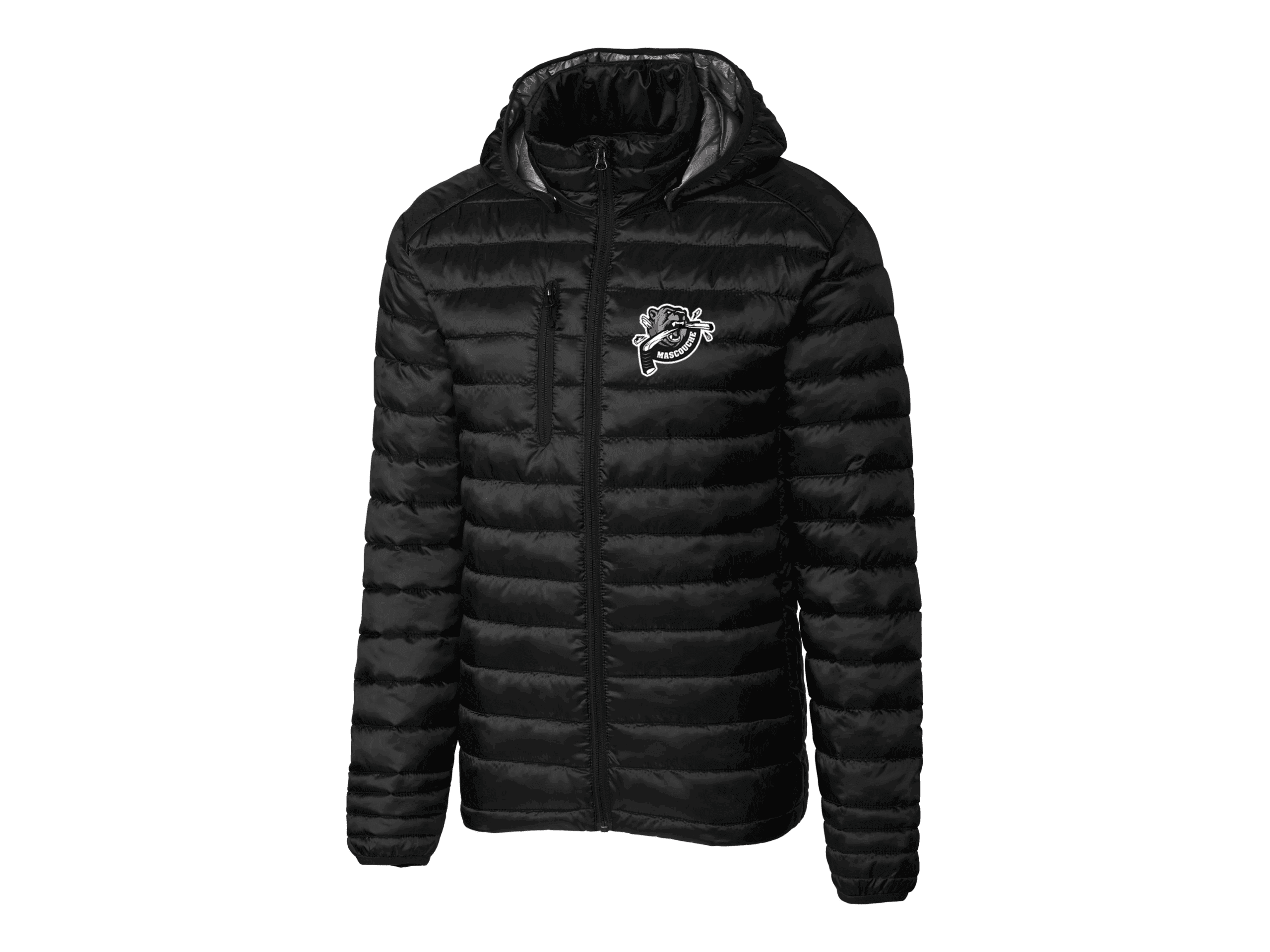 37 g/m2 “ 1.1 oz./yd2 “ 2 oz./vg lin. Taffetas 100 % nylon avec fini hydrofuge. Doublure isolante; 100% polyester recyclé légère. Fermeture à glissière YKK à l’avant. Poches à glissière sur les cotés. Capuchon amovible à glissière. Acces pour broderie grace à une fermeture à glissière. Ruban lastéique noir à l’ourlet et à l’ouverture du capuchon.