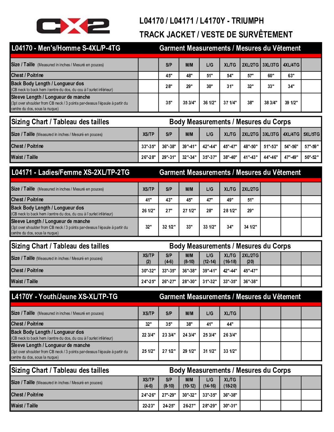 Femme (X-Small), Femme (Small), Femme (Medium), Femme (Large), Femme (X-Large), Femme (2X-Large), X-Small Enfant, Small Enfant, Medium Enfant, Large Enfant, X-Large Enfant, Homme (Small), Homme (Medium), Homme (Large), Homme (X-Large), Homme (2X-Large), Homme (3X-Large), Homme (4X-Large)
